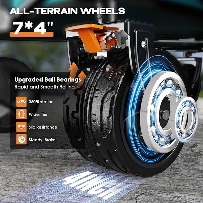 - 【Long-Lasting Efficient Transport】: Wide wheels do better on complex terrains. The sturdy wheels are made of PP+PVC, which has perfect maneuverability and higher transportation efficiency than others. It can roll over obstructions such as rocks, roots, and even curbs. The wheels have double bearings to maximize the carrying capacity and safety, which reflect its performance. Keep in mind, though, wagons don't work on soft sand.