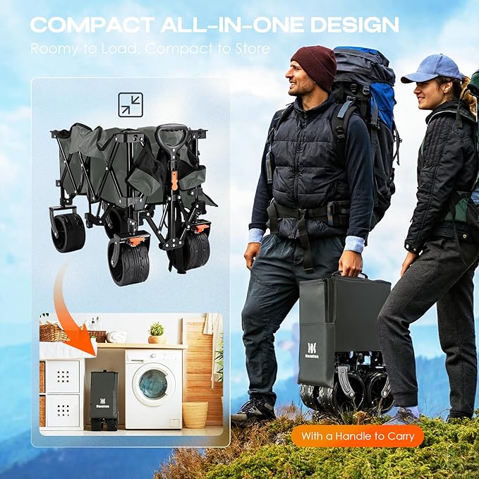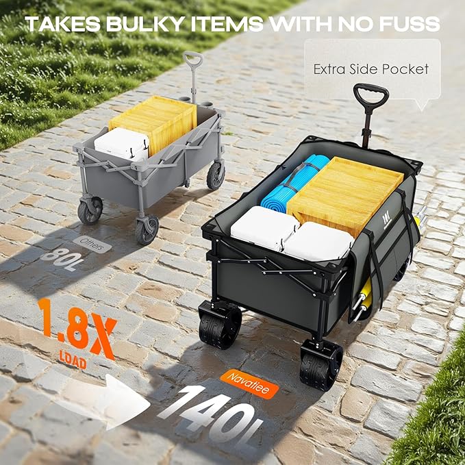 - EXCELLENT ADDITIONAL PERFORMANCE : Our side pocket will give you way additional storage capacity than other wagons. You can put the umbrella or camping gear in it. It has two mesh cup holders to keep your drinks upright during transport. The ergonomic shape of the handle is for easier pulling and hauling to reduce labor that allows for smooth control. Our great value wagons are sure to serve you for many years and make your companion in your outdoor life.