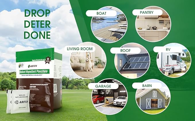 - NATURALLY DETER MICE. ARFEN rodent repellent pouch offers a sustainable alternative, effectively urging mice away from your home without causing harm. Safeguard your home, garage, car, truck, or RV with a time-released scent blend of peppermint, cinnamon, rosemary oil and castor oil. A convenient pest control barrier for any residence.