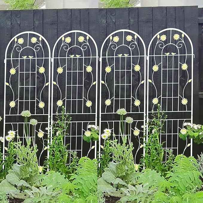 - 【Multi Purpose Garden Trellis】This 4 pack outdoor garden trellis provides support for climbing plants, such as ivy, rose, cucumber, and as garden wire mesh grid. The high metal trellis can be used to form privacy screens.