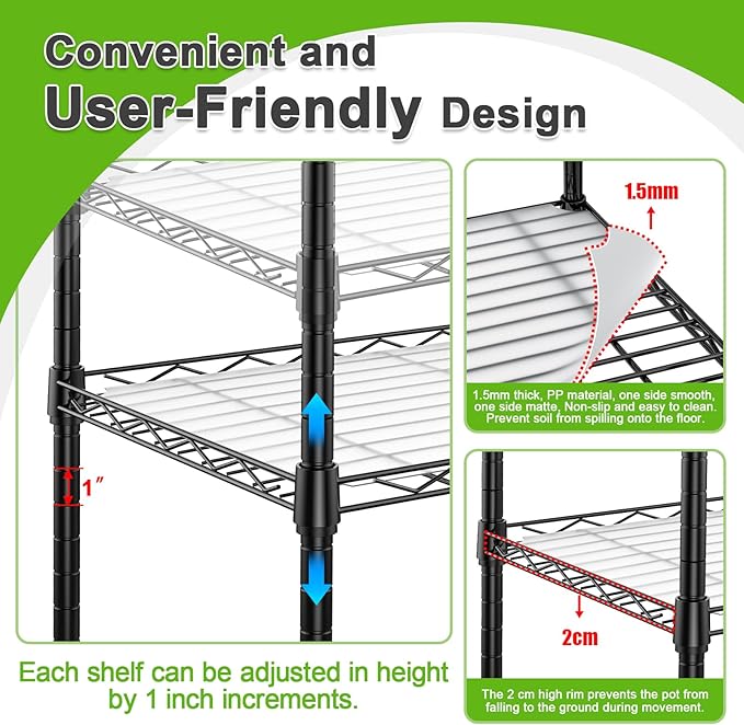 - Very Flexible Design: You can configure it as a 5-tier shelf, and each shelf's height is adjustable in one-inch increments. This adaptability allows you to accommodate plants of various sizes. If you need extra space, the shelves are removable. Removable hard plastic shelf liners line each shelf, ensuring a sturdy base for plant pots and preventing drips or debris from falling.