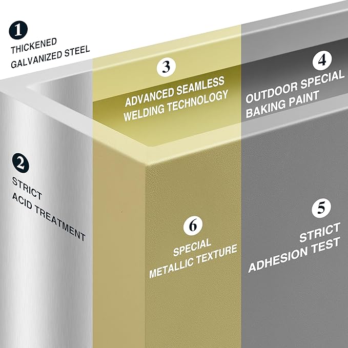 - 【Span Metal Planter】This tall planter box is made from a fully seam welded thick galvanized steel, and adopts outdoor special baking paint, giving the surface a premium metallic color and special texture through the advanced powder injection process.