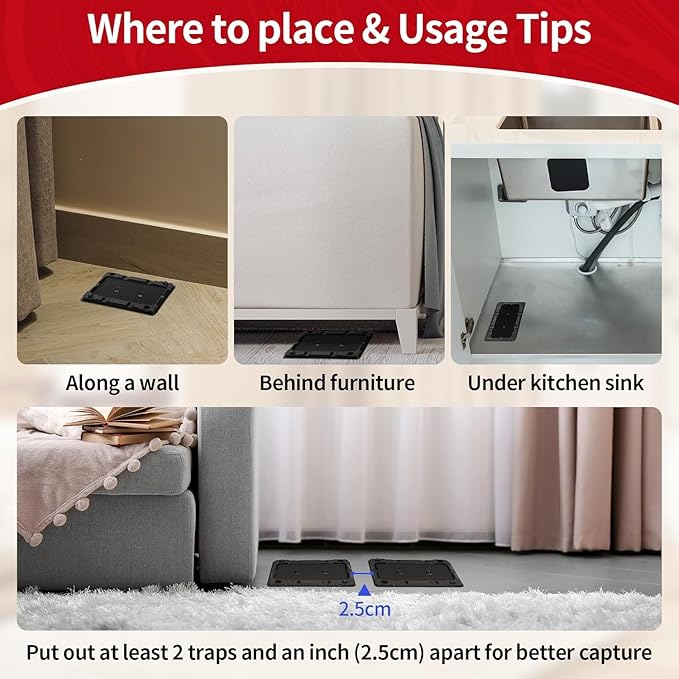- WARM TIPS for Optimal Performance: To ensure maximum effectiveness of your roach traps indoor, keep the area free of dust before placing the glue traps. Regularly check the traps and replace them as needed to maintain their adhesive strength, ensuring your mouse trap remains effective against all unwanted pests.