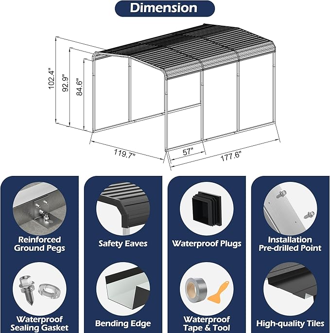 - 【More Upgraded Features】Safety eaves are installed at the front and rear of the carport, enhancing both aesthetics and roof safety. The carport base is reinforced with anchor bolts and thick steel plates, securely linking it to the ground. Waterproof plugs are fitted to the tubes frame to minimize ground water penetration
