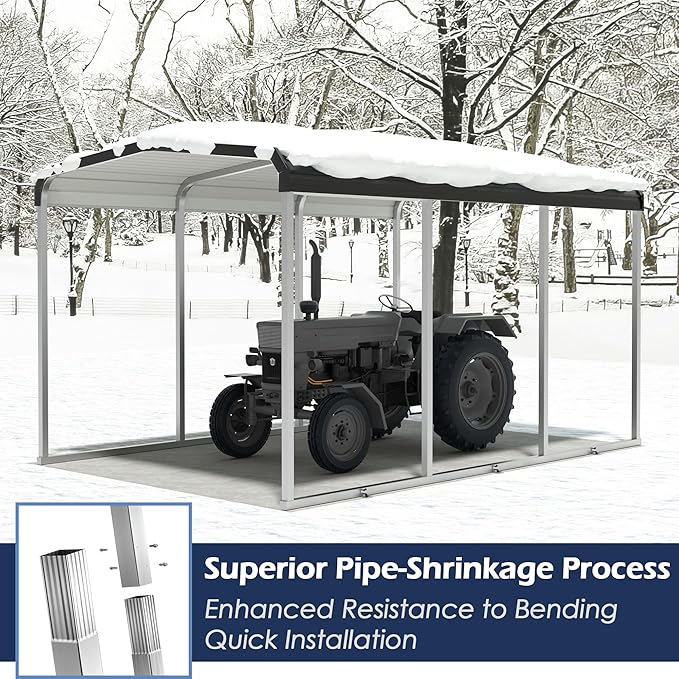 - 【Superior Pipe-Shrinkage Process】Each joint of the metal carport frame undergoes a pipe-shrinkage process. The original steel tubes are pressed under high pressure to form small-size wave tubes, enhancing resistance to bending. This process significantly strengthens the weakest joints of the frame, ensuring greater stability