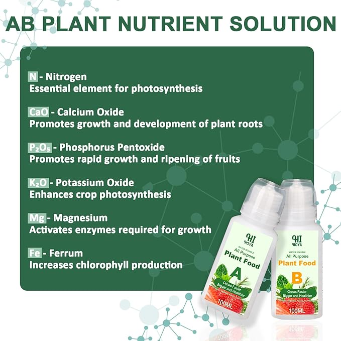 - Nutrient Rich Plant Food: A&B plant food one bottle makes 100ml of odorless fertilizer that feeds instantly. Grow stronger and rapid rooter. For all types of feeding methods: soil drench, foliar feed and hydroponic