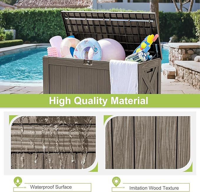 - Large Storage Capacity: The storage box is in 52.3”(L) x 24.2”(W) x 25.4”(H), and it has 120 gallons of storage space, which can perfectly place your garden tools, pool gear and etc, make sure your space looks clean and tidy.