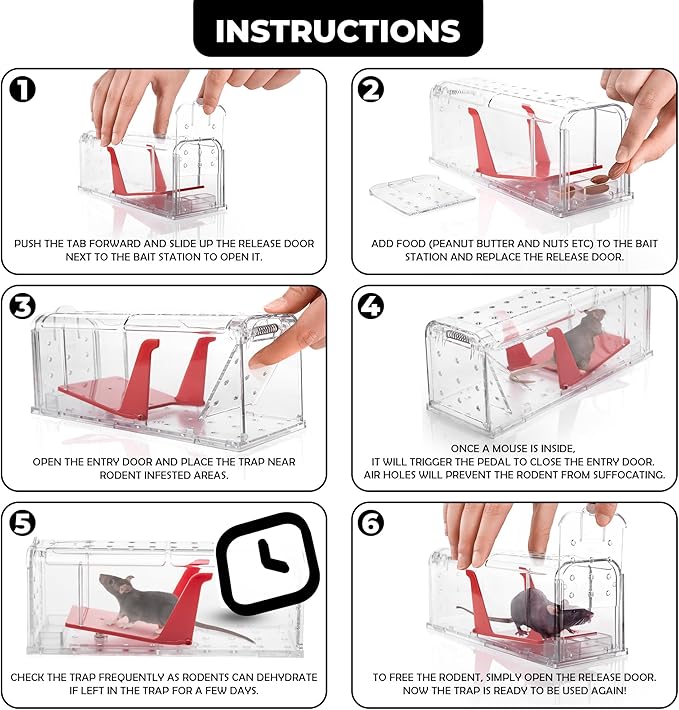 - Easy to Use: Simply place the bait in the designated area and open the spring door. Once the mouse is trapped it will trigger the pedal to close the entry door.