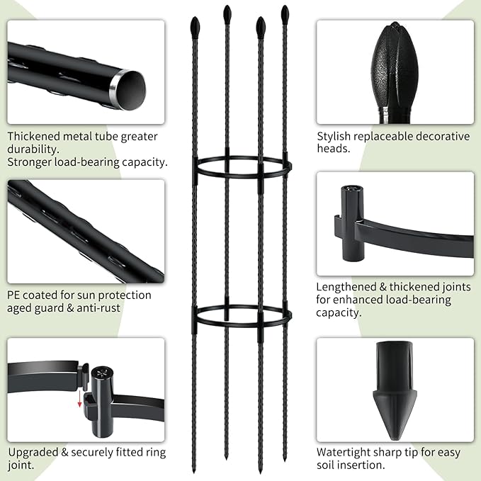 - 🍅【Heavy Duty Metal Support Stakes 】-Garden plant holders consist of 1cm thick metal rods and plastic sleeves that are rust,sun,and fade resistant.This structure can be perfectly adapted to various environments and is your reliable choice for any seasons.This sturdy and stable plant stakes can provide good support for medium to large vegetables, flowers and plants.