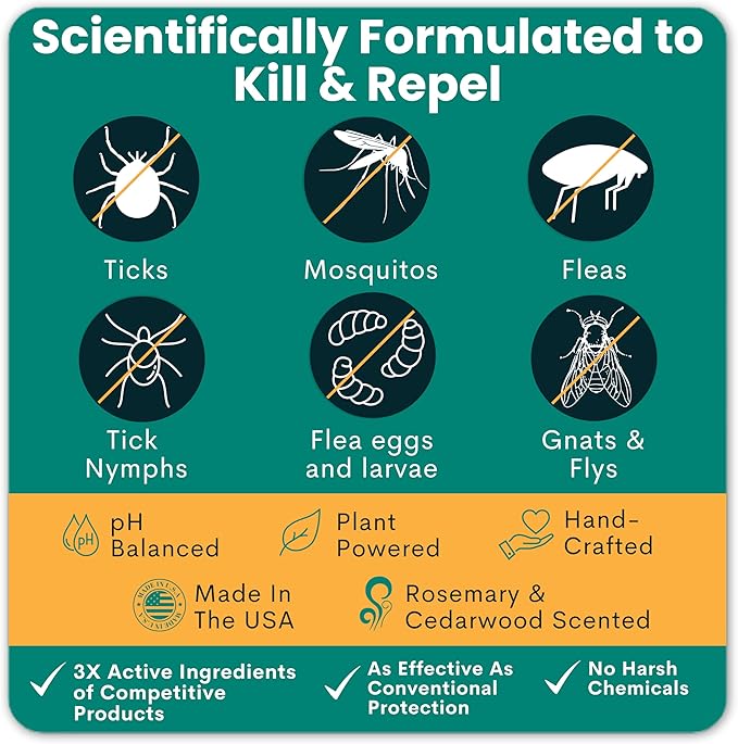 - β SUPERIOR EXTRA STRENGTH EFFECTIVENESS: Our formula contains 3X the active ingredients of similar natural products, delivering superior, long-lasting protection against fleas, ticks, mosquitos and other pests. Enjoy exceptional pest control at a fraction of the cost of our competitors.