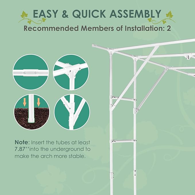 - Suitable Size -- Our grape vine support arch arbor is 118'' L x 79'' W x 90.5'' H, designed specifically for growing climbing plants and vegetables. It can provide enough growing space so that you can maximize your harvest and yield. And the plant trellis’ height is easy for you to pick the fruits or decorate your gardens.