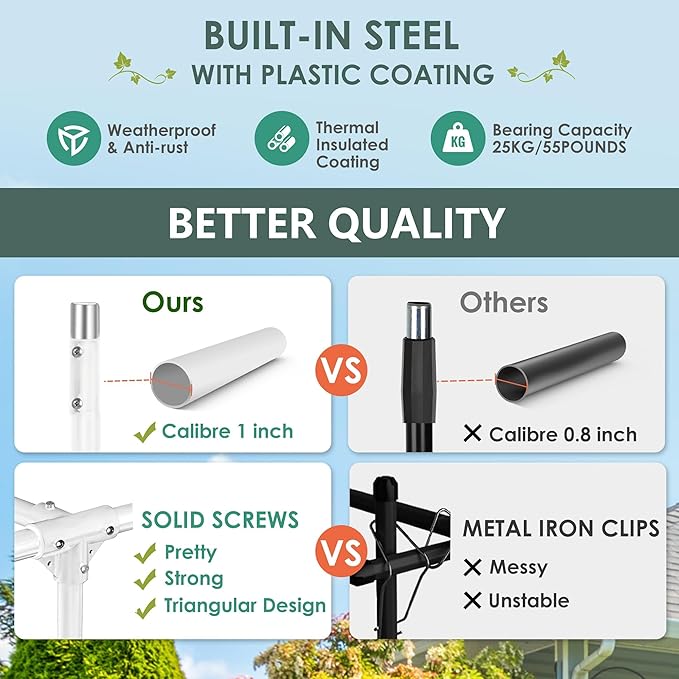 - Premium Material -- The garden trellis is made of top-norch materials, and sturdy built-in steel with plastic coating. The durable frame is weatherproof, providing strong support for your climbing plants and keeping a good condition even in long time damp and humid conditions.