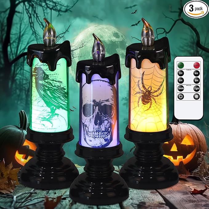 - [Spooky Decal]: Vivid Halloween theme decals, crow decal in green lights, Skull decal in purple light, spider web decal in yellow light. Make these LED pillar candles widely suitable for your home Halloween decor needs