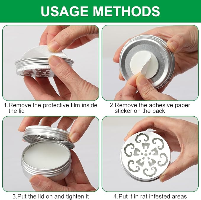 - Easy to use: The mice repellent is individually packaged, you only need to take out the car engine rodent repellent paste, tear off the white protective film on the metal cover and tighten the cover, then tear off the 3M tape at the bottom, stick the mouse repellent on the place you need.