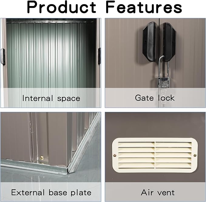 - π‘ Durable & Safe Metal Sheds: The 6x4 metal sheds & outdoor storage house is made of uniquely designed aluminum frames and thicker galvanized steel, coated with high quality painting to last a long time. To protect your safety, each screw is with a plastic protective shell and corner shells are designed for anti-collision. Lockable sliding doors allow easy access to your stored items without fear of children and animals straying in to ensure security.