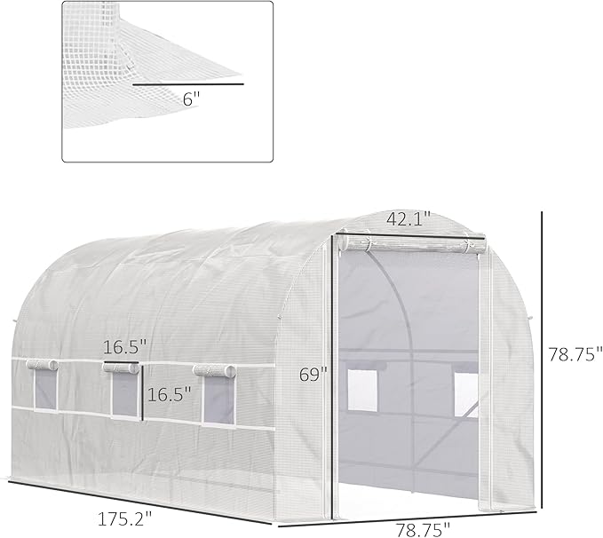 - Ventilated Roll-Up Windows and Doors: Regulate moisture with six roll-up windows and manage air flow with the large, zippered door of our outdoor greenhouse. These features allow for fine-tuned ventilation, helping to maintain optimal growing conditions while providing easy access and secure closure.