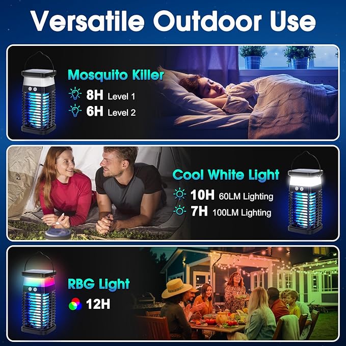 - Versatile Outdoor Use: Engineered for flexibility, this bug zapper offers three mosquito killer modes (Level 1 and Level 2 for varying intensities) and three illumination modes (60lm and 100lm lumination, plus an RGB light mode). Whether you're camping, hosting a BBQ, or enjoying a quiet night outdoors, this device adapts to your needs.