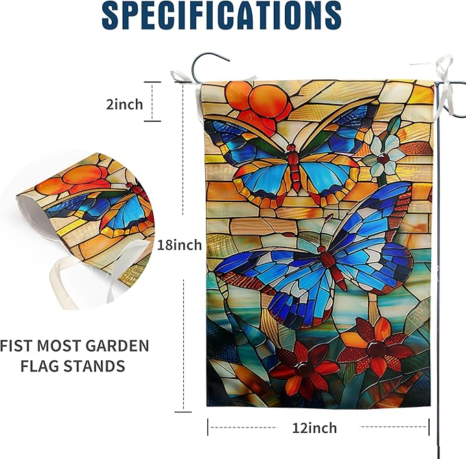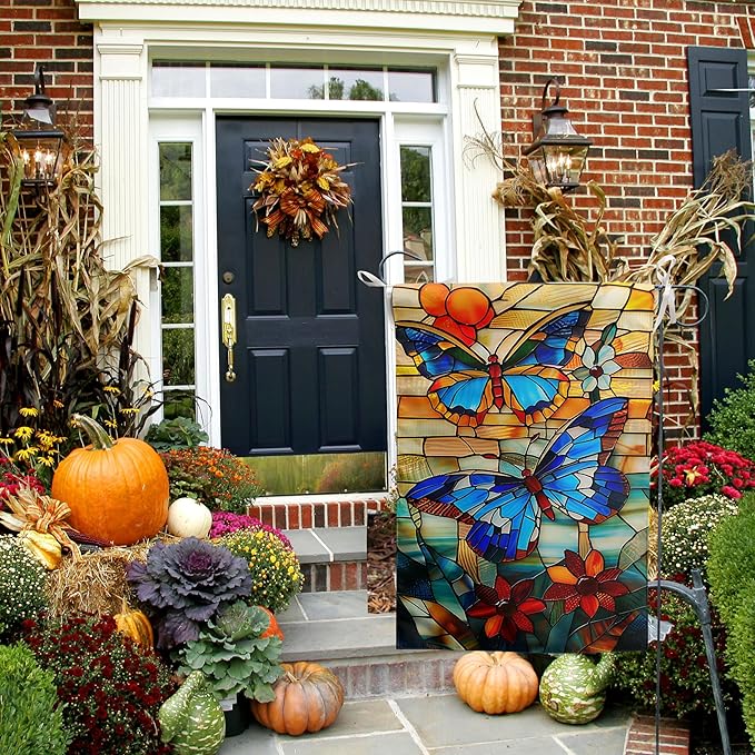 Stained Glass Butterfly Garden Flag Spring Summer Yard Flag Fall Floral Decorative Flags for Outside 12x18 Double Sided Small Seasonal Lawn Flags Rustic Outdoor Decor