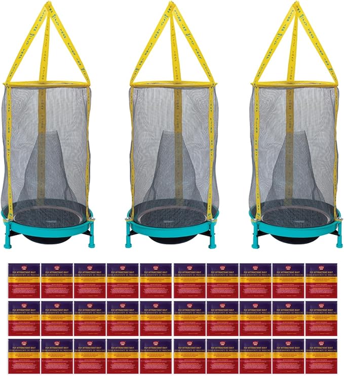 EZ Fly Cage Ranch Fly Trap with 2 Flies Inn Fly Attractant Bait Refill, Low Odor, Reusable, Built to Last for Years (3 Trap + 36 Baits, 1)