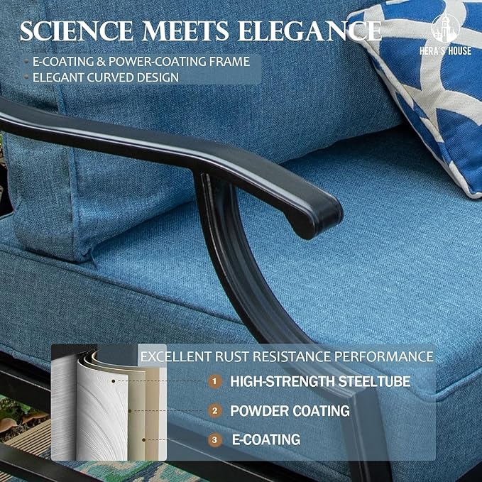 - 【E-COATING & POWDER-COATING TECHNIQUE】ALL the furniture set metal frame of conversation sets are processed by high-performance E-COATING and POWDER-COATING technique which provides extended protection against rust, scratches, rain, and UV harm. All weather resistant, anti-rust, easy to clean, no special care needed.