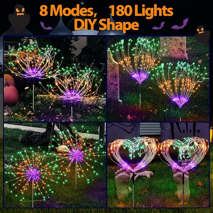 Halloween Decorations Outdoor 4 Pack Colored Solar Firework Lights with 180 LED Halloween Solar Lights 8 Modes Green Orange Purple Outside Lights for Yard Pathway Patio Garden Party Decorations