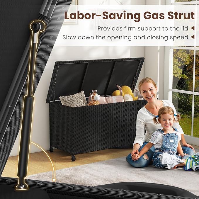 Tangkula Rattan Deck Box, 85 Gallon Storage Container with Waterproof Liner, Wheels & Gas Strut, Indoor Outdoor Wicker Storage Cabinet, Storage Furniture for Pillows, Cushions (Black)