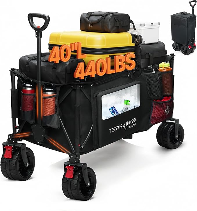 - 【Spacious & Versatile Design】The TerrainGO bundle includes a collapsible wagon with a generous 260L capacity and a 440lbs weight limit, perfect for hauling coolers, sports gear, and groceries. It folds down to just 12.6"x20"x34.2", making storage in your car or garage a breeze, ideal for beach trips, camping, or daily errands. 12" OPTIONAL BEACH WHEELS SOLD SEPERATELY