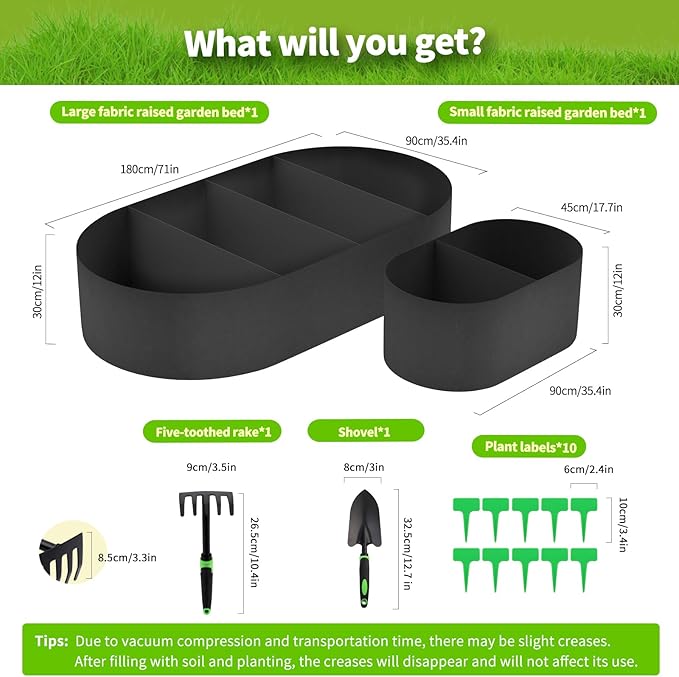 - GREAT SET FOR GARDENING:You will get 1 large 4-compartment fabric plant bag 6FT x 3FTx 1FT, 1 small 2-compartment fabric plant bag 3FT x 1.5FT x 1FT, and a gardening tool set , including hand shovels, hand rakes and plant labels. Multi-compartment design allows you to grow different plants in different areas. Managing your growing area is easy and efficient, keeping your plants looking neat and organized