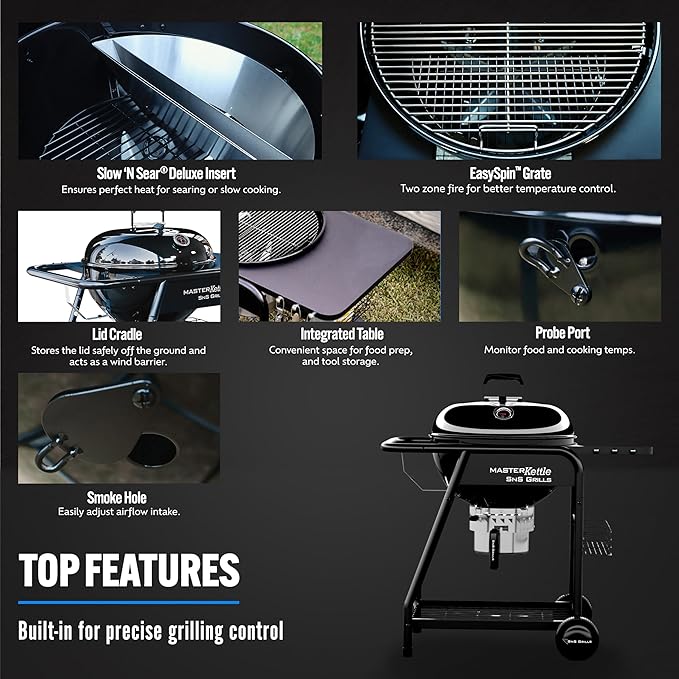 SnS Grills MasterKettle Charcoal Grill and Smoker with Patented Slow ‘N Sear Deluxe Insert, EasySpin Grate for Two-Zone Cooking and Integrated Table, Low ‘N Slow Smoking and BBQing - Black 22-Inch