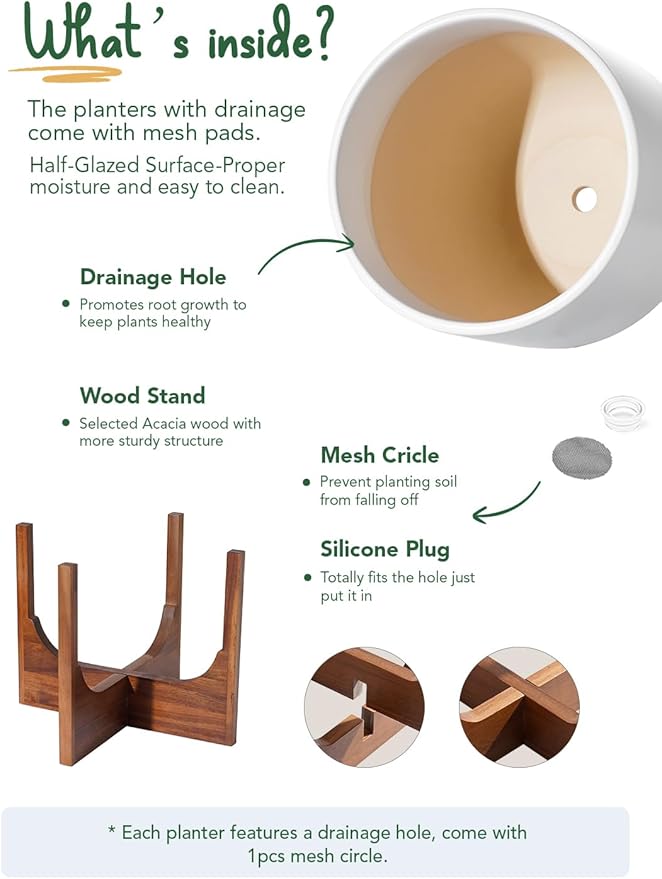 - Complete Set: This planter with draiange hole includes a ceramic pot, wooden stand, drainage plug, and mesh pad, providing everything you need to create a thriving indoor garden
