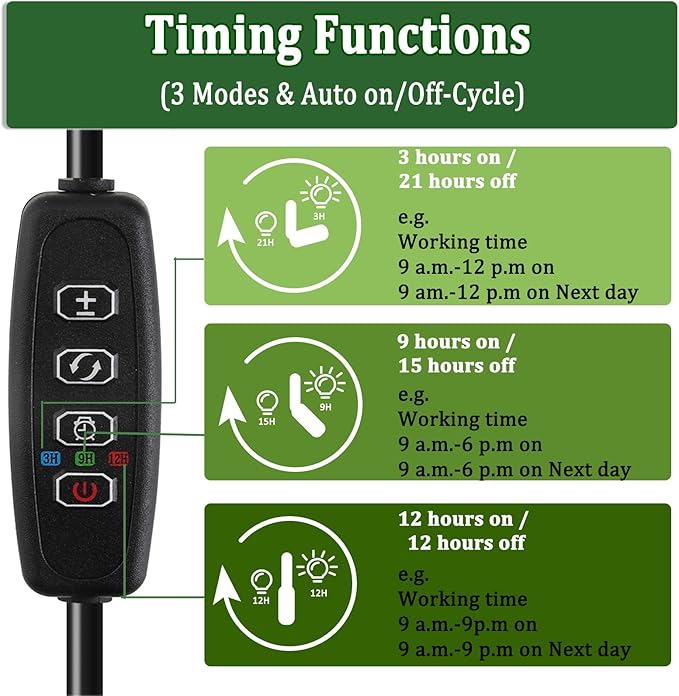 - 【Auto On/Off in Cycle and 3/9/12H】 Equipped with an auto on/off feature,grow lights ensures that your plants receive consistent lighting without manual set. It automatically switches on at your pre-set time and turns off after the programmed duration—either 3, 9, or 12 hours. Then, it will trun on after 21/15/12hrs—ensuring a perfectly timed and worry-free growing environment. (Note: Keep the power always on after set the timer)