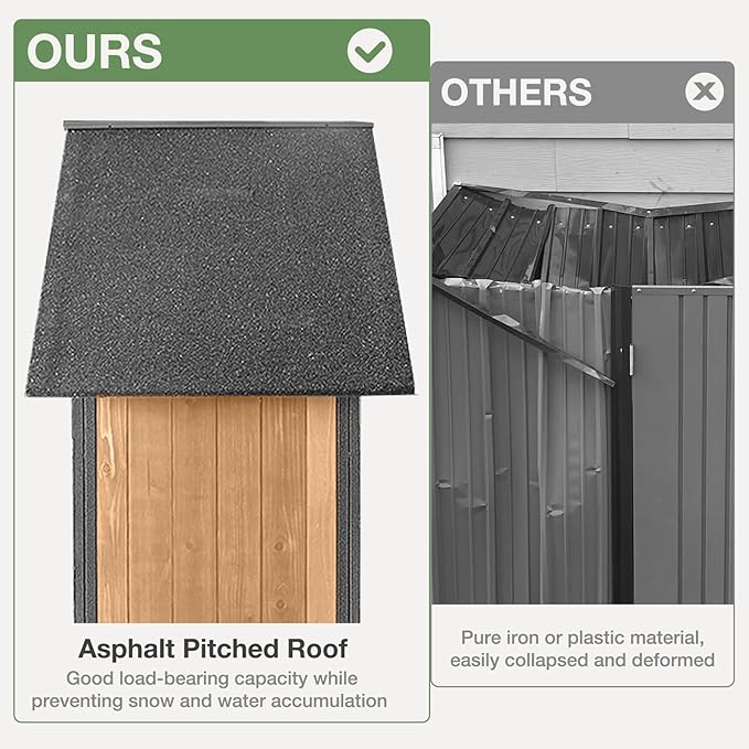 - 🛖【Waterproof Design】: This storage shed features an asphalt peaked roof that protects against rain and snow simultaneously! The raised wood floor prevents water from seeping in and ensures that the storage space is dry and safe