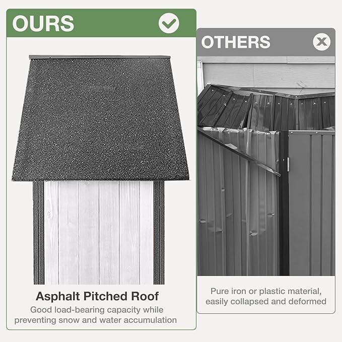 - 🛖【Waterproof Design】: This storage shed features an asphalt peaked roof that protects against rain and snow simultaneously! The raised wood floor prevents water from seeping in and ensures that the storage space is dry and safe
