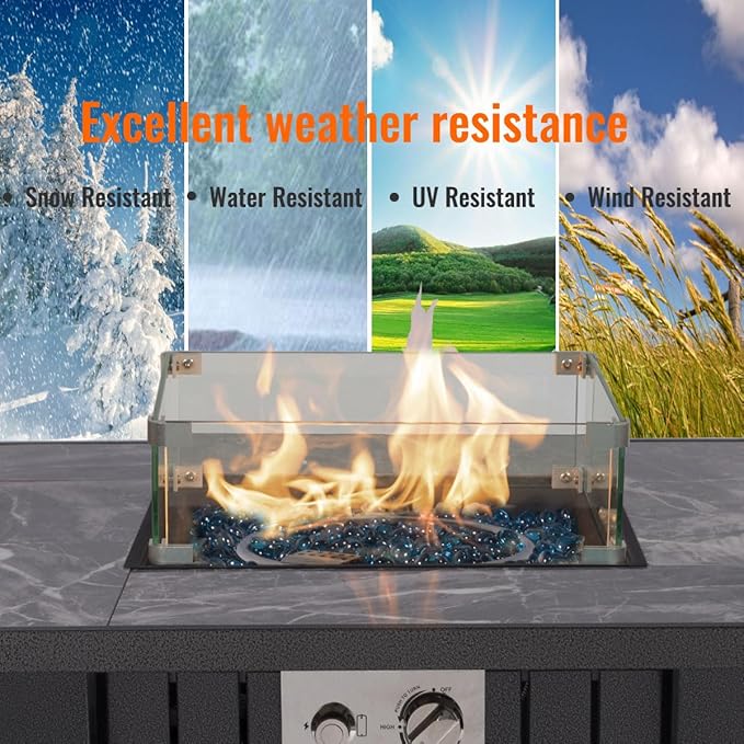 - 🔥🔥【Glass Wind Guard】It is firepit table for propane. Our fire pit tables for outside patio are subjected to a mail-order drop test and 100% ignition test. When the fire pit is heating which will produce 50,000BTU, We use glass wind guard to keep the flame safe and beautiful.