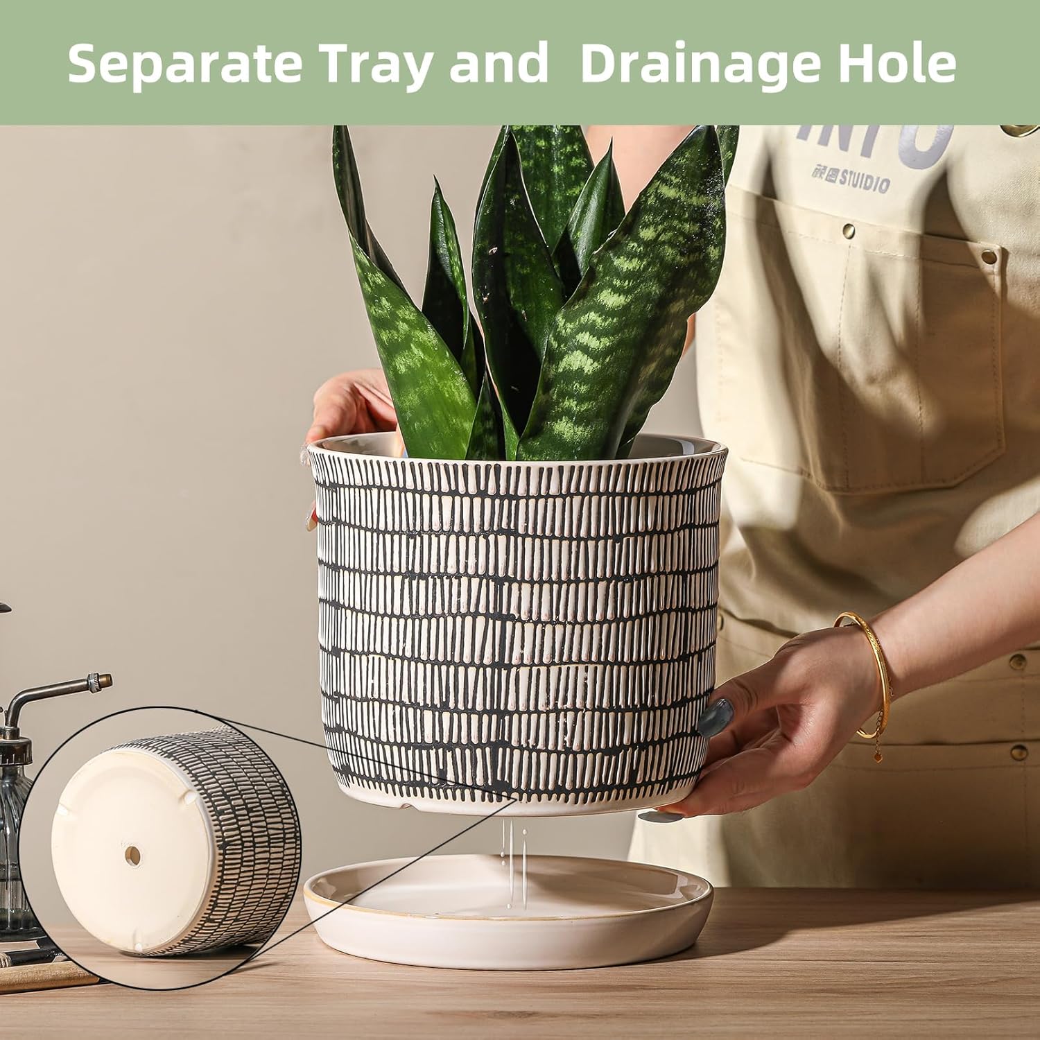 8 Inch Plant Pot: Ceramic Planter with Drainage Hole & Saucer - Cylinder Flowerpot for Indoor & Outdoor Plants - with Separate Tray for Home & Office - Striped Design
