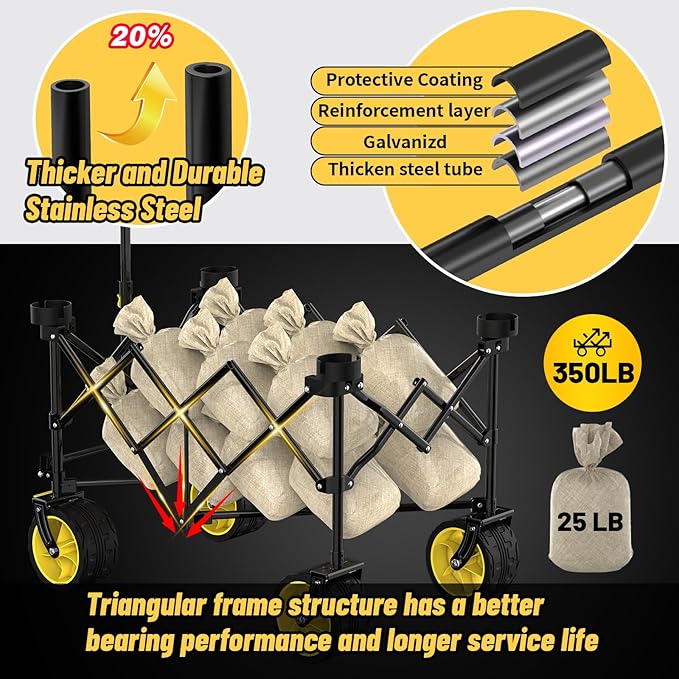 - 【Lasted Firm Frame Structure&Stronger 600D Oxford Fabric】 : This wagon cart uses the thicker antioxidant galvanized stainless steel frame and more stable triangular support structure( thicker 20%),which strengthens overall load-carring capacity and never lose their shape.In order to Increase garden cart’s flexibility and practicability,the new design- two thick Oxford strips are used to fix and support the whole frame.Besides stronger and waterproof 600D Oxford fabric is not easily torn apart