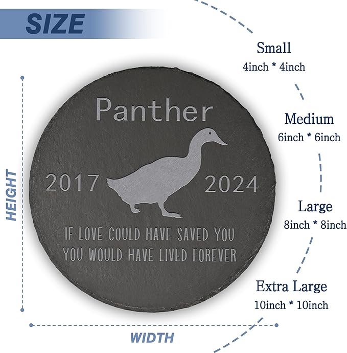 - 🐶Personalized Pet Memorial Gifts: Our personalized memorial stone is a very memory gift for who have lost their pet family members. The pet memorial stone can be customized with name and date, making it a great way for people to remember their passing Duck.