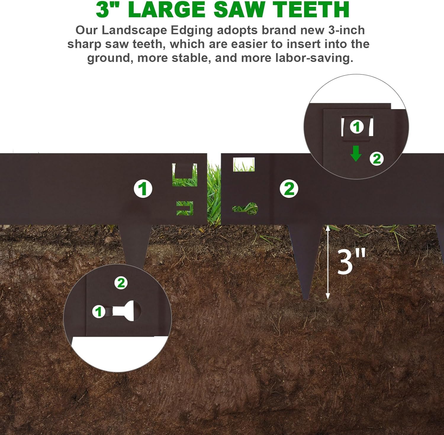 - [3" Large Saw Teeth] - Our Steel Landscape Edging adopts brand new 3-inch sharp saw teeth, the no-dig design, along with the included clips, which are easier to insert into the ground. The 7 inch depth is perfect for keeping mulch and soil in place while preventing grass from encroaching into your flower beds