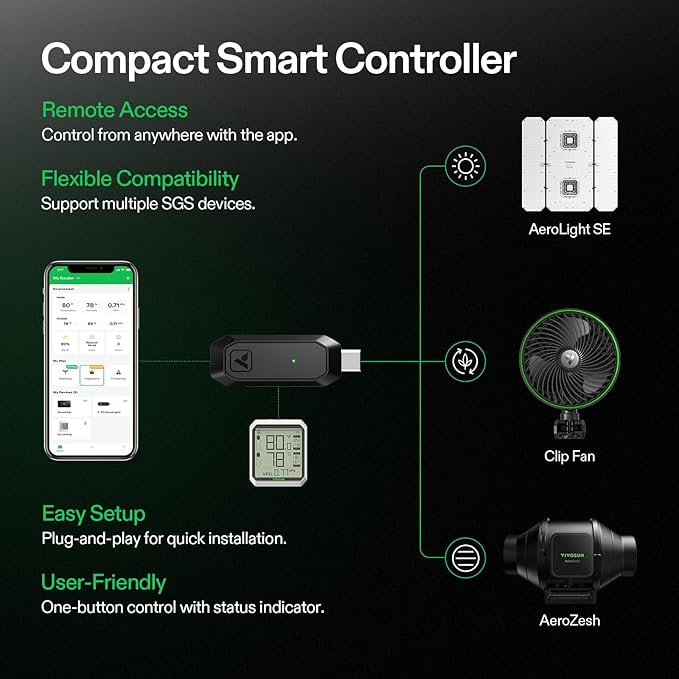 - GrowHub Controller E25: Connect to the Vivosun Smart Grow System with the GrowHub Controller E25 to monitor and control the AeroLight via the Vivosun App; Compatible with various devices, it takes care of your plants from seed to harvest