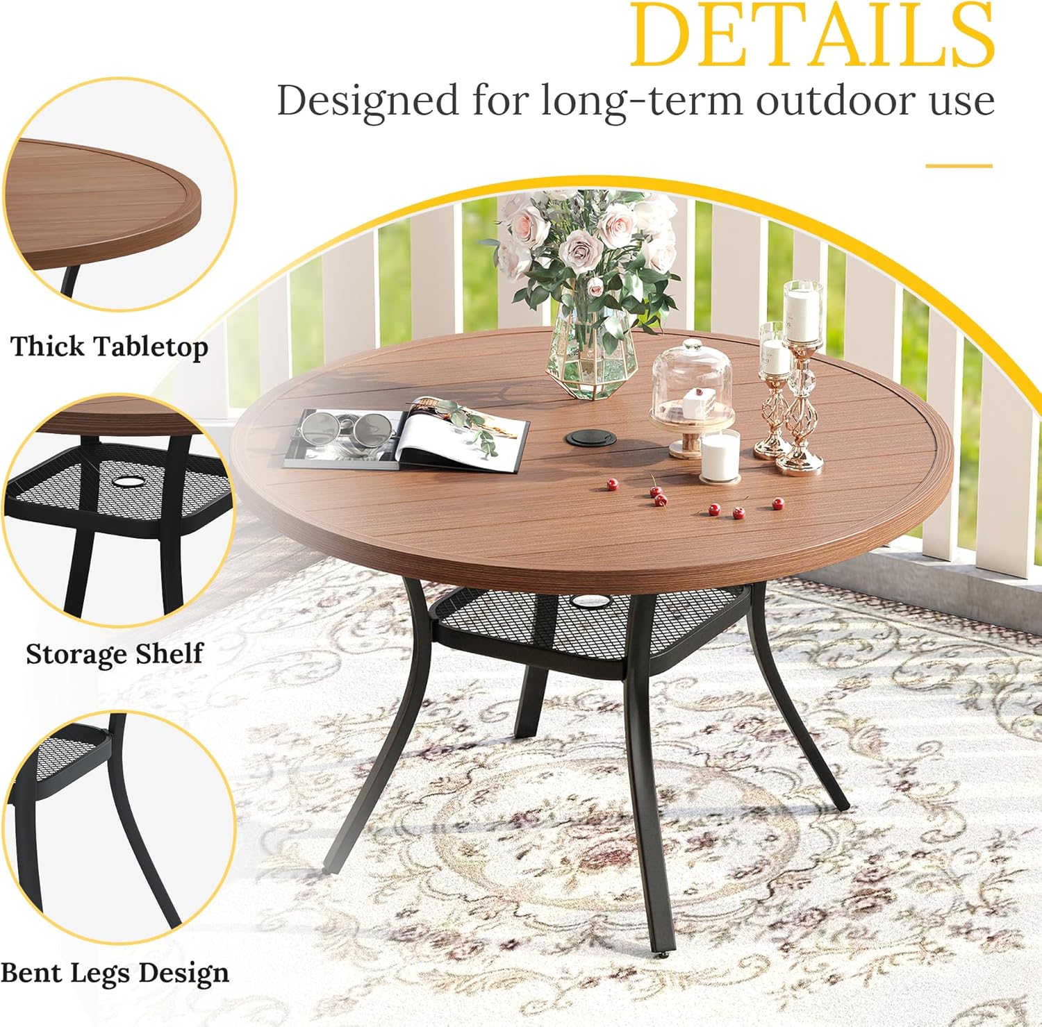 VICLLAX 47.2" Outdoor Round Patio Table for Lawn Garden, All Weather Metal Round Outdoor Dining Table with Adjustable Umbrella Hole, 6 Person Patio Table, Walnut Wood-Like Tabletop