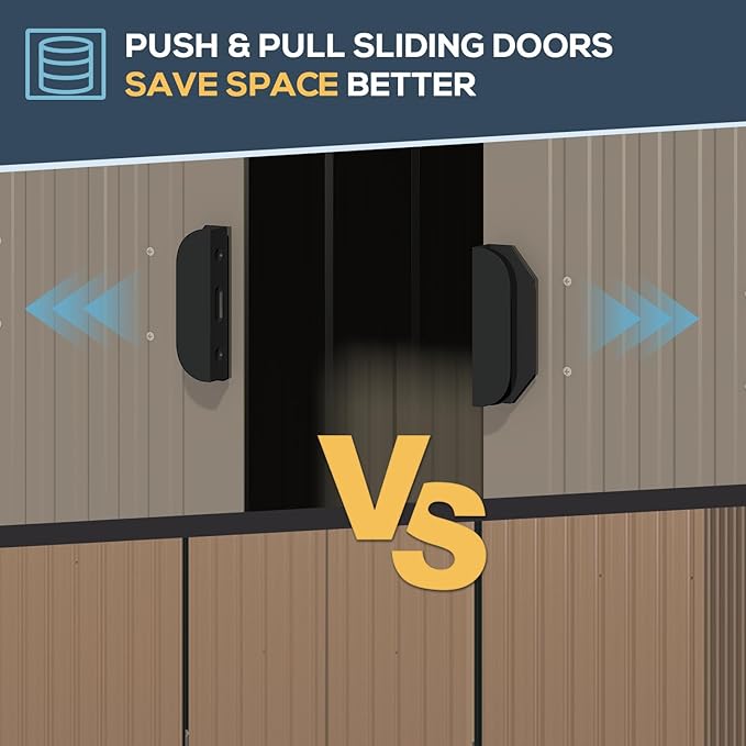 - Spacious Storage: Measuring 6 by 8 ft, this storage shed offers ample interior space. It can accommodate 7 lawnmowers, 10 kids' bicycles, 8 snowmobiles, or 3 Vespa motorcycles, thanks to its sliding door design that maximizes usable space.