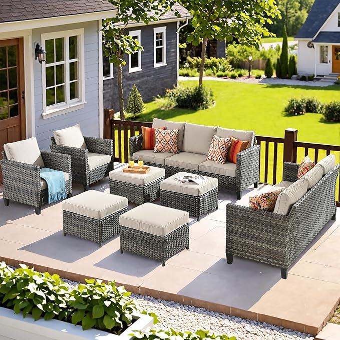 - 12 Seats Furniture: Ottomans can be combined the 3-seats sofa, couch or single chair into a chaise, it can also be used as a coffee table and side table for outside. OVIOS 8-pieces outdoor patio furniture set comes with all hardware & necessary tools.