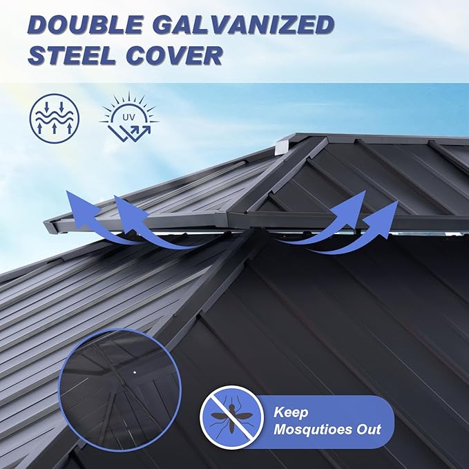 - HIGH-STRENGTH METAL ROOF — Constructed with 3mm thick galvanized steel plates, the frosted black hard top of this permanent gazebo is designed for superior load-bearing capacity up to 3500 lbs. The dense arrangement of steel sheets ensures longevity against severe weather conditions. Advanced electroplating technology protects the coating from sun exposure or rain, preventing rust and ensuring the roof's integrity.