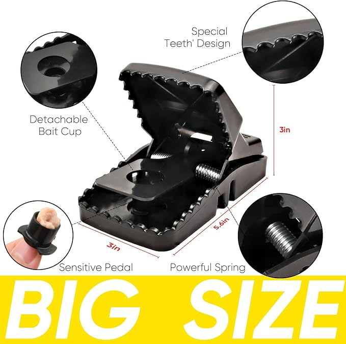 - LARGE SIZE CLAMP PLATE DESIGN: The large size clamp plate combined with reinforced spring makes the trigger area larger and more sensitive, accurately catching rodents of different sizes.