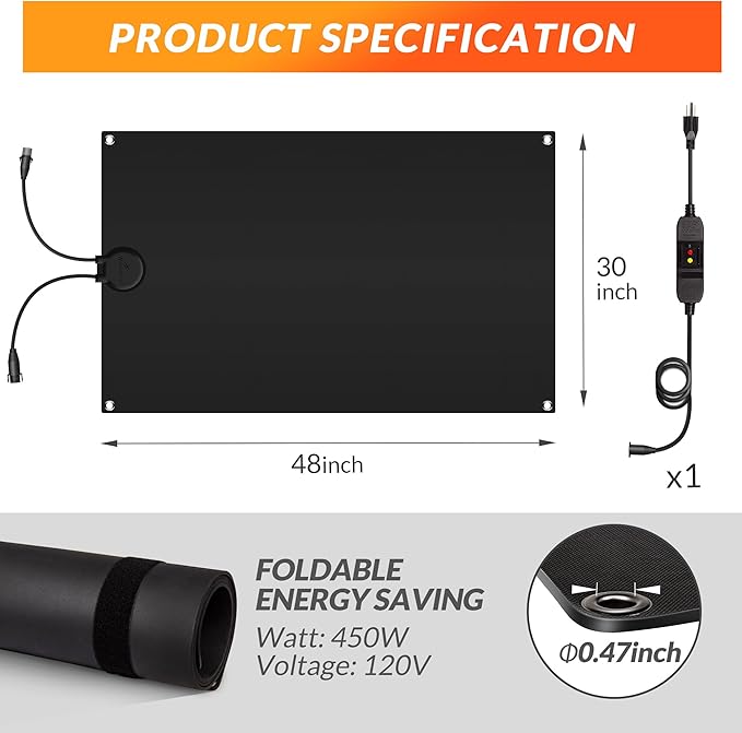 - Easy Installation: Our ice melting mats come with a 11.5 ft power cord, UL-listed plug, leakage protection, velcro and working status indicator. Simply lay the pad flat and plug it into a 120V outlet. You can use it alone or connect two mats together. (Caution: When you connect multiple ice melting mats, notice the total power does not exceed 1500W ). It also comes with rustproof grommets for extra anchoring. Providing you with maximum security.