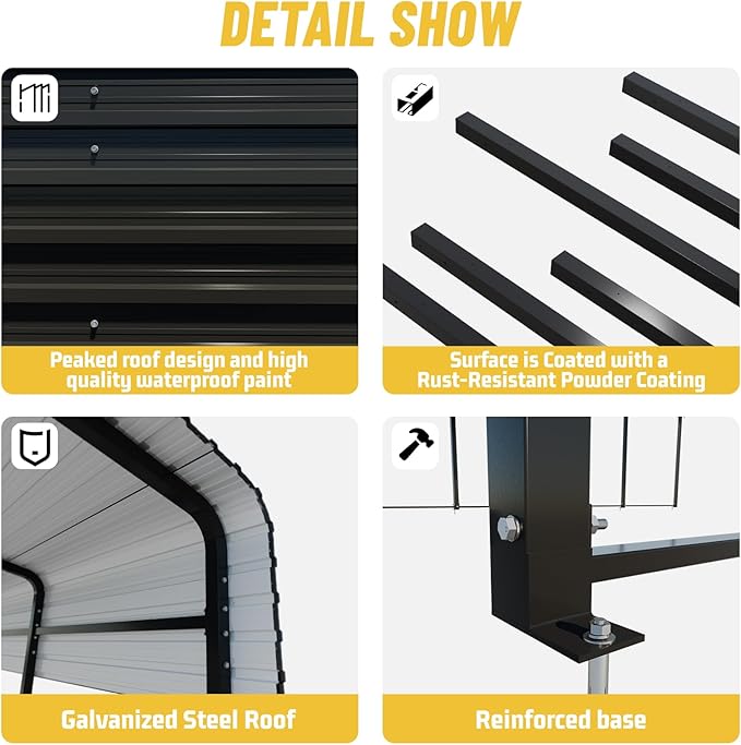 - Sturdy and durable: The metal carport is made of high quality galvanized steel and 1.5"x 1.5" powder coated tube frame, carefully reinforced at key locations to ensure unmatched strength and flexibility, while also effectively preventing rust and maintaining the integrity of the exterior.The garage is designed to withstand rain, snow, wind and other weather conditions.Wind Rating: 100 MPH; Snow Load Capacity: 35 PSF