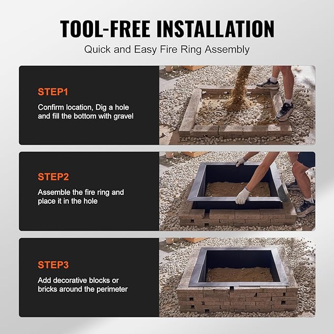 VEVOR Fire Pit Ring, 36x36 in Outer/30x30 in Inner Diameter, 10inch Height Square Fire Pit Insert, Heavy Duty Carbon Steel Liner DIY Campfire Ring Above or In-Ground, for Outdoor Camping, Bonfires