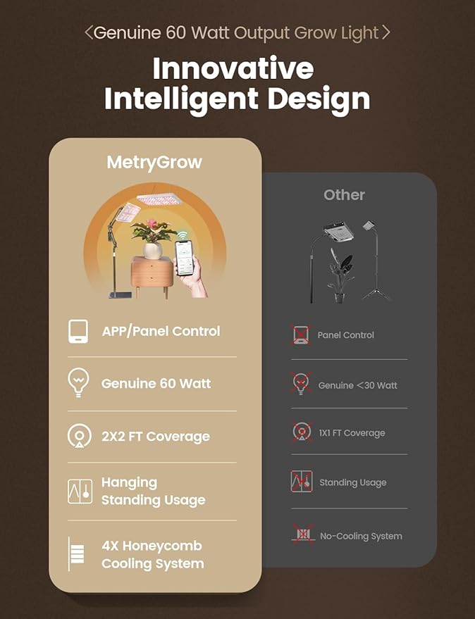 - 【Powerful 60W LED】: Unlike other products with exaggerated claims, our Smart Plant Light boasts a genuine 60-watt LED with 8 adjustable brightness levels and a patented light spectrum. This full spectrum grow light delivers exceptional PPFD performance, accelerating plant growth by up to 200% compared to traditional plant lights. With a 2x2 ft coverage area, it maximizes your gardening efficiency, making it perfect for a 2x2 grow tent and ensuring your plants thrive faster and healthier.