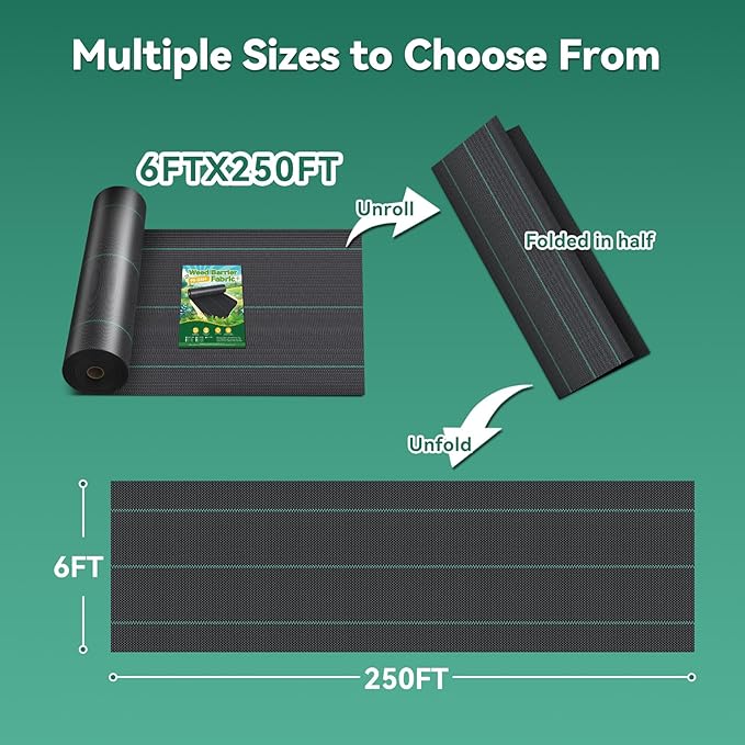 - 【Pro Installation Made Easy】The green marking lines on the weed mat make it easy to cut neatly. With them, you can accurately arrange your pots in a line to make your garden more organized. For install, just unroll and unfold (Note: weed block is folded in half before rolled), cut and lay flat to your desired area. No professional skills required.