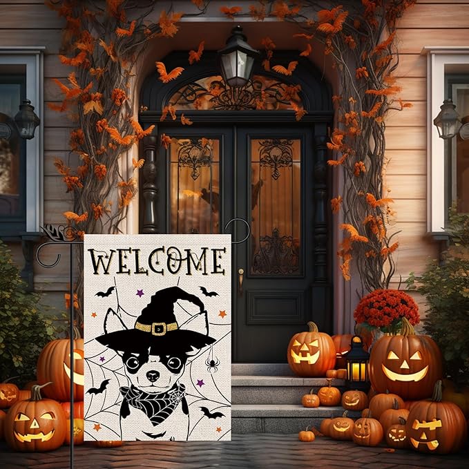 Halloween Garden Flag Chihuahua Cobweb Bats Double Sided Vertical Welcome Flag Seasonal Holiday Outdoor Yard Lawn Party Decorations 12.5 x 18 Inch
